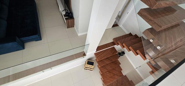 • Salas amplas e integradas, com pé-direito alto e grandes panos de vidro